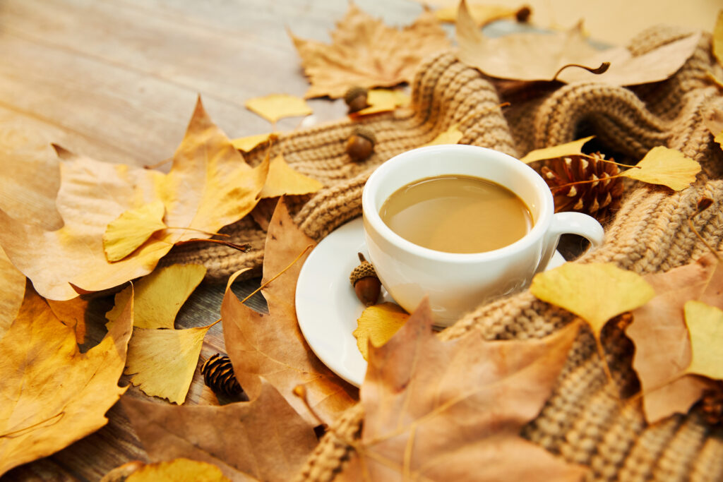 A closeup shot of a cup of coffee and autumn leaves on wooden background