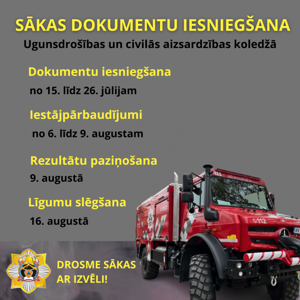 Līdz 26. jūlijam notiek jauno studētāju uzņemšana Ugunsdrošības un civilās aizsardzības koledžā (UCAK), kas atrodas Rīgā, Ķengaraga ielā 3/1. Aicinām ikvienu interesentu vecumā no 18 līdz 40 gadiem pieteikties studijām un kļūt par daļu no Valsts ugunsdzēsības un glābšanas dienesta (VUGD) komandas!
