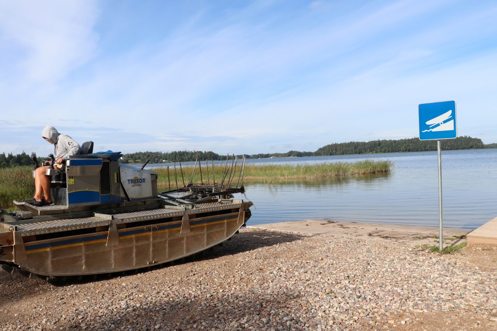 PĻĀVĒJS UZ PONTONIEM. Vismaz reizi gadā Alūksnes ezerā nepieciešams pļaut niedres, lai veicinātu to iznīkšanu. Jau novērots, ka vietās, kur iepriekšējos gados šis process veikts, niedres kļuvušas retākas. Pļaujmašīna (attēlā) tiek nomāta, un Alūksnes novada pašvaldības aģentūra “Alja” pērk šo pakalpojumu.
