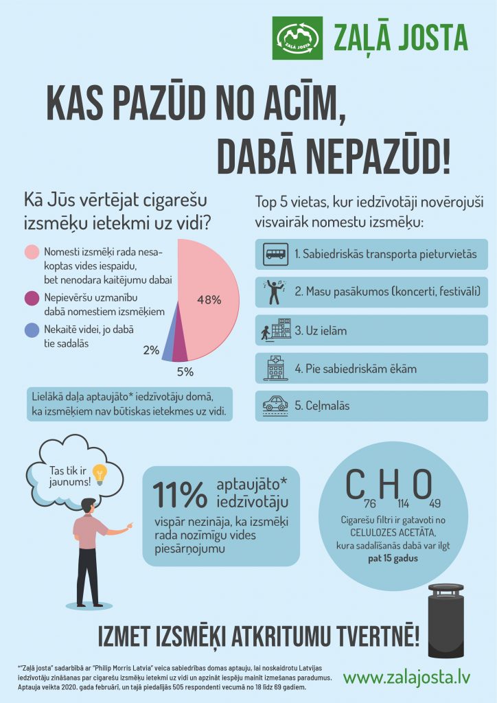 “Kampaņa “Kas pazūd no acīm, dabā nepazūd” ir loģisks turpinājums šī gada sākumā veiktajam pētījumam, kas apliecināja, ka ir būtiski nekavējoties sākt darbu pie cigarešu izsmēķu radītā piesārņojuma mazināšanas Latvijā,” norāda “Zaļā josta” pārstāve un šī projekta vadītāja Laima Kubliņa. “Zaļā josta” un “Philip Morris Latvia” 2020. gada sākumā veiktajā sabiedrības aptaujā atklājās, ka 37% aptaujāto ir informēti, ka izsmēķi rada nozīmīgu kaitējumu videi, turpretī 47% respondentu atzina, ka nekad nav aizdomājušies par izsmēķu nelabvēlīgo ietekmi uz vidi, bet, loģiski spriežot, tas šķiet pašsaprotami. “Taču diemžēl lielākais vairums aptaujāto apliecina, ka neizprot patieso izsmēķu radīto kaitējumu videi. 48% respondentu atzina, ka zemē nomesti izsmēķi rada tikai nesakoptas vides iespaidu, bet neuzskata, ka tie nodara kaitējumu videi. 11% aptaujāto iedzīvotāju fakts, ka cigarešu izsmēķi rada nozīmīgu vides piesārņojumu, bija jaunums,” atklāj L. Kubliņa, uzsverot, ka ir būtiski rīkoties jau tagad.