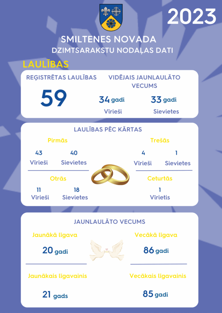 Noslēdzot 2023. gadu, Smiltenes novada Dzimtsarakstu nodaļā izdarīti 425 civilstāvokļa aktu reģistri. Reģistrēts 131 jaundzimušais, tas ir par 26 jaundzimušajiem mazāk nekā 2022. gadā. Dzimtsarakstu nodaļā reģistrētas 59 laulības (2022. gadā – 81),  t.sk. 3 laulības  noslēgtas Smiltenes novada baznīcās. Reģistrēti 235 miršanas fakti, tas ir par 27 vairāk nekā 2022. gadā. Nodaļā tiek veikti dažādi ar personas dzimšanu, laulību, miršanu un citiem svarīgiem dzīves faktiem saistīti reģistri. Pērn saņemti 7 iesniegumi par  uzvārda maiņu un viens iesniegums par tautības maiņu, informē Smiltenes novada Dzimtsarakstu nodaļas vadītāja Dace Ērģele.
