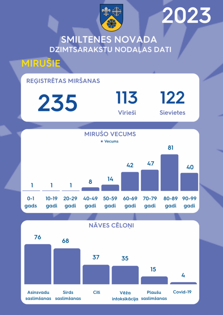 Dzimtsarakstu nodaļā 2023. gadā reģistrēti 235 miršanas fakti, to skaitā 203 novada iedzīvotāji un 32 citās pašvaldībās dzīvojošie. Mirušas 122 sievietes un 113 vīrieši.  Mirušo personu skaita teritoriālais sadalījums ir sekojošs: Smiltene – 52, Ape – 9, Apes pagasts – 3, Bilskas pagasts – 24, Blomes pagasts – 7, Brantu pagasts – 6, Drustu pagasts – 13, Gaujienas pagasts – 9, Grundzāles pagasts – 10, Launkalnes pagasts – 11, Palsmanes pagasts – 12, Raunas pagasts – 15, Smiltenes pagasts – 11, Trapenes pagasts – 9, Variņu pagasts – 8, Virešu pagasts – 4. Mirušo personu sadalījums pēc vecumiem: 0-1 gadam – 1 persona; 10-19 gadi – 1 persona; 20-29 gadi – 1 persona; 40-49 gadi – 8 personas; 50-59 gadi – 14 personas; 60-69 gadi – 42 personas; 70-79 gadi – 47 personas; 80-89 gadi – 81 persona; 90-99 gadi – 40 personas. Visaugstākais mirušo personu skaits bija februārī un martā (32), vismazākais (8) – septembrī. Apkopotā informācija liecina, ka 2023. gadā galvenie nāves cēloņi – asinsvadu saslimšanas (76), sirds saslimšanas (68), vēža intoksikācija (35), plaušu slimības (15), COVID-19 vīrusa infekcija (4) un citi (37).