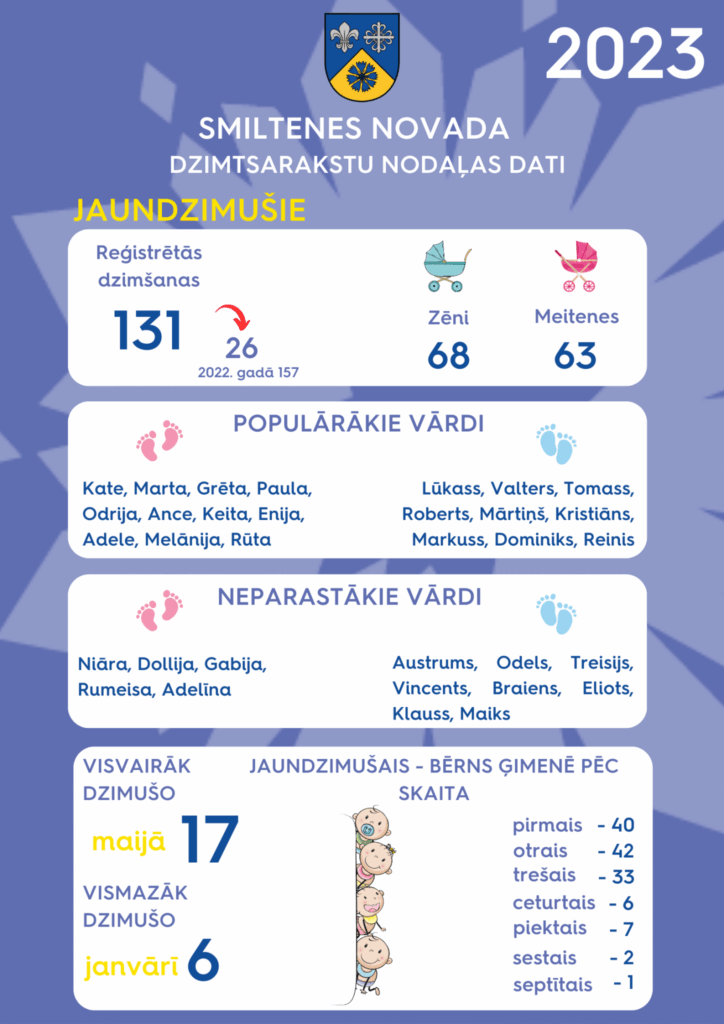 Dzimtsarakstu nodaļā pagājušajā gadā izveidots 131 dzimšanas reģistrs. 127 bērniņu deklarētās dzīvesvietas ir mūsu novadā, bet 4 bērniņu – citā pašvaldībā. Vienai ģimenei ir dubults prieks, tajā ieradās dvīnīši – divi puikas Dāvis un Henrijs. 57 bērniņi dzimuši laulībā esošiem vecākiem, 69 bērniem atzīta paternitāte, piecos dzimšanas reģistros ir norādītas ziņas tikai par bērna māti. 40 ģimenēs dzimis pirmais bērniņš, 42 ģimenēs – otrais, 33 ģimenēs trešais mazulis, sešās ģimenēs sagaidīts ceturtais bērns, septiņās ģimenēs dzimis piektais bērns, divās ģimenēs dzimis sestais un vienā ģimenē septītais bērniņš. Pēc dzimuma sadalījuma – 63 meitenes un 68 zēni.