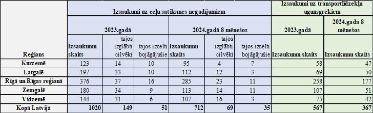 Šī gada astoņos mēnešos ugunsdzēsēji glābēji devās uz 712 ceļu satiksmes negadījumu seku likvidēšanas darbiem, kuros izglāba 69 cilvēkus un atbrīvoja 35 bojāgājušos, kā arī saņemti 367 izsaukumi, kuros dega transportlīdzekļi. Aizvadītajā gadā 1020 ceļu satiksmes negadījumu likvidēšanas darbos izglābti 149 cilvēki un atbrīvots 51 bojāgājušais, bet transportlīdzekļi dega 567 reizes.
