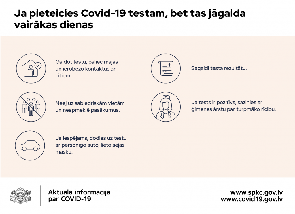 Šobrīd var būt situācijas, kad, piemēram, ārpus Rīgas cilvēkiem ar saslimšanas simptomiem ir jāgaida vairākas dienas, lai veiktu Covid-19 testu. Šajā laikā ir jāpaliek mājās un nevajadzētu doties uz darbu, neatkarīgi no tā, vai ir novērojami saslimšanas simptomi, vai nekādu simptomu nav. Ja novērojami saslimšanas simptomi, jāsazinās ar ģimenes ārstu par turpmāko rīcību. Ja ir bijis kontakts ar saslimušo, arī gaidot sava testa rezultātus, nevajadzētu iet uz darbu, apmeklēt pasākumus, publiskas vietas u.tml. Šeit (pdf) var iepazīties ar ieteikumiem, kā rīkoties, gaidot Covid-19 testa rezultātu.