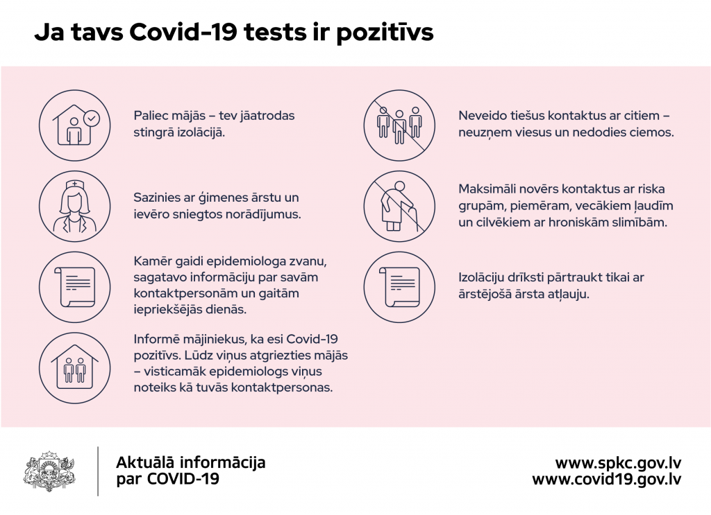 Ja ir saņemts pozitīvs testa rezultāts, kas apliecina Covid-19 infekciju, jāpaliek mājās – nedrīkst dodies uz darbu, veikalu vai citām sabiedriskām vietām. Jāsazinās ar cilvēkiem, ar kuriem dzīvo kopā – ja viņi jau devušies uz darbu vai skolu, jālūdz viņus atgriezties mājās, jo, iespējams, šie cilvēki ir tuvās kontaktpersonas. Uzzinot atbildi par pozitīvu Covid-19 testu, jāpiezvana savam ģimenes ārstam, lai konsultētos par veselības stāvokli un jāseko ārsta norādījumiem.