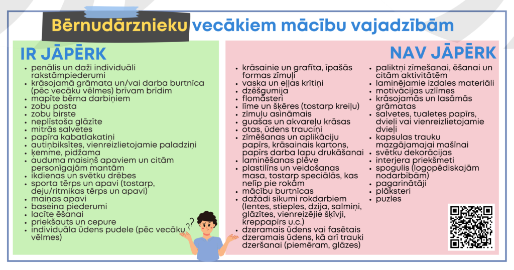Tāpat vecāku apjukumu rada kancelejas preču iegāde – pirmsskolā ir grūtāk nodalīt kancelejas piederumus, kas jāpērk vecākiem, no rotaļnodarbībām nepieciešamajiem mācību līdzekļiem, kas jāpērk izglītības iestādei par sava budžeta līdzekļiem. Atšķirībā no skolām bērnudārzos tādas lietas kā zīmuļi, flomāsteri, otas, dzēšgumijas, šķēres u.c. nav jāsarūpē vecākiem pašiem – tos nodrošina bērnudārzs, jo tie nepieciešami izglītības satura apguvei.
