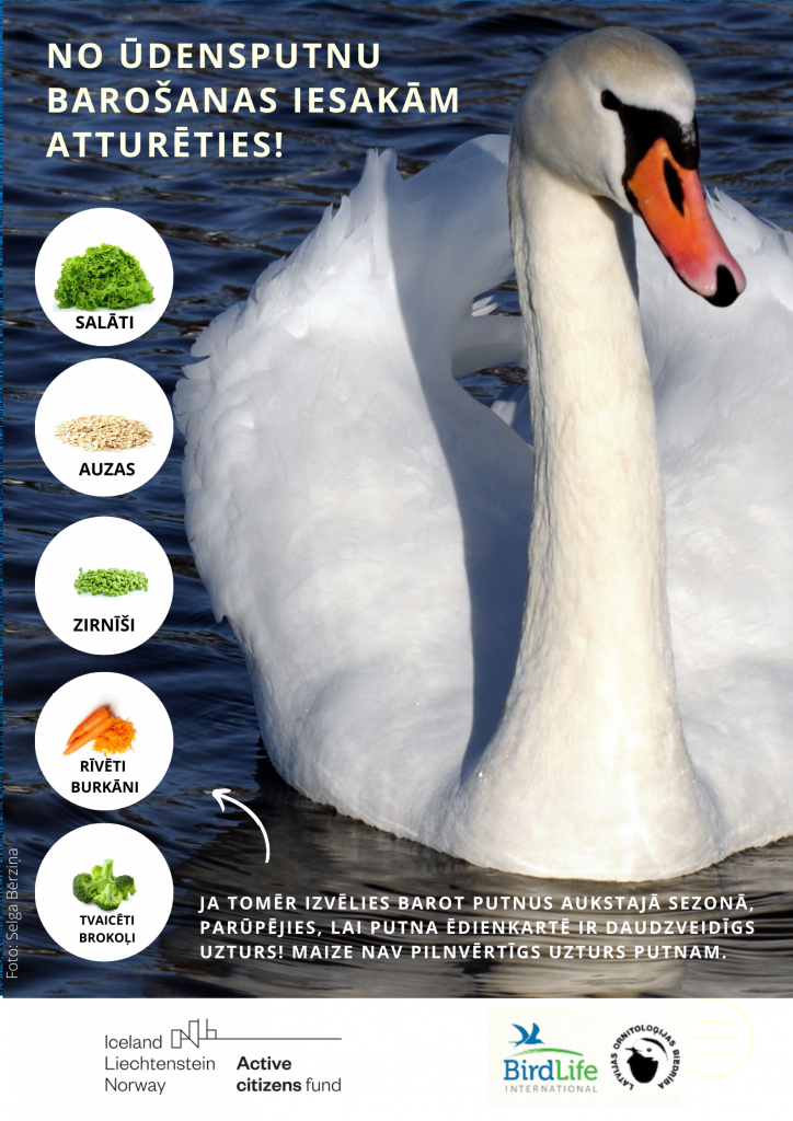 Latvijas Ornitoloģijas biedrība mudina sabiedrību izvērtēt ūdensputnu barošanas paradumus, atturoties tos barot ar maizi, kas nav pilnvērtīgs uzturs pīlēm, gulbjiem un citiem ūdensputniem, kam izdzīvošanai nepieciešama daudzveidīga barība.