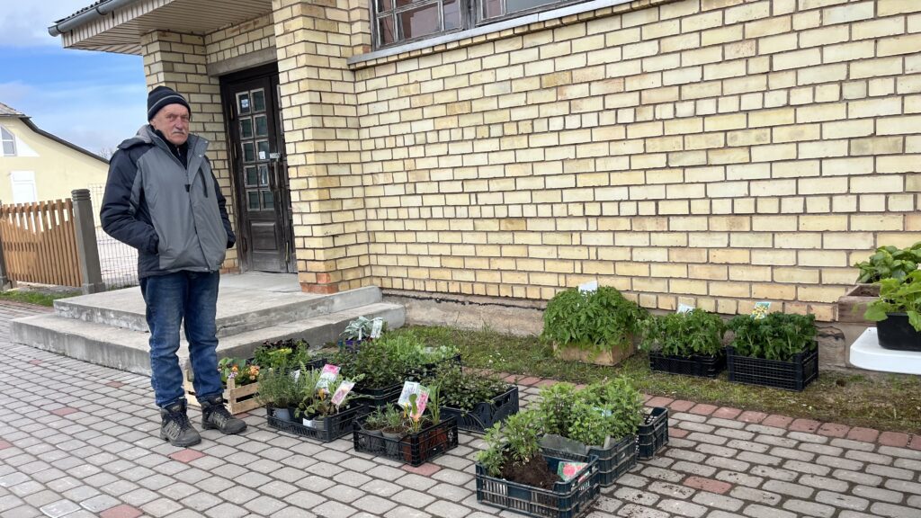 Ar savu izaudzēto produkciju jau otro reizi pēc kārtas Latgales ielā 3a tirgojas zemnieku saimniecības “Tereški – 9” īpašnieks Edgars Brilts. Viņš ar vietu pašlaik ir apmierināts, līdzi paņēmis savus galdus, uz kuriem izvietojis ziemciešu, garšaugu, salātu un zemeņu stādus. “Mēģinu pierast pie jaunajiem tirdzniecības apstākļiem, pašlaik ir normāli, bet vēlāk, kad sāksies īstā sezona, būs pašauri. Jā, tagad pircēju vēl pamaz, auksts,” saka E. Brilts.