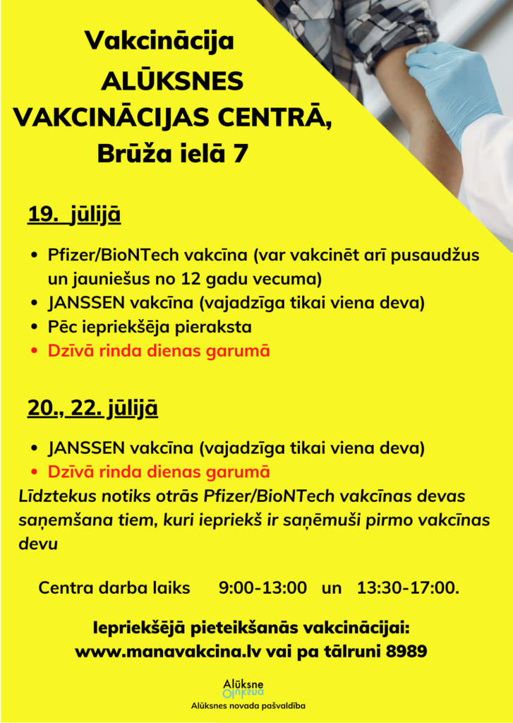 Alūksnes vakcinācijas centrā nākamnedēļ, 19. jūlijā, pret Covid-19 būs iespējams vakcinēties gan ar JANSSEN vakcīnu (tikai viena deva), gan ar Pfizer/BioNTech vakcīnu (var vakcinēt arī pusaudžus un jauniešus no 12 gadu vecuma), informē Alūksnes novada pašvaldības sabiedrisko attiecību speciāliste Evita Aploka.