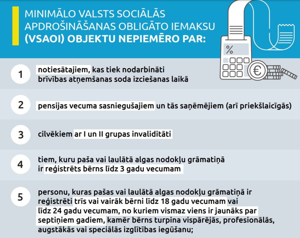 No 1. jūlija ir stājušās spējā izmaiņas likumā “Par valsts sociālo apdrošināšanu”, kas nosaka, ka paredzētās minimālās iemaksas ir obligāts maksājums, ko par katru sociāli apdrošināmo personu veic vismaz no valstī noteiktās minimālās mēneša algas. Minimālo iemaksu objekts ir trīs minimālās algas – 1500 eiro ceturksnī jeb 500 eiro mēnesī.