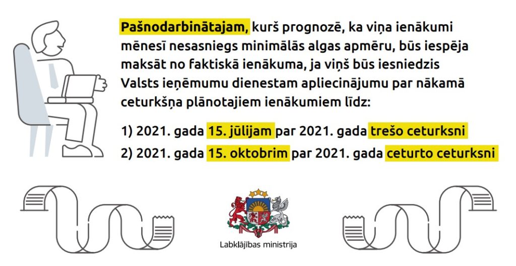 Pašnodarbinātajam, kurš prognozē, ka viņa ienākumi mēnesī nesasniegs minimālās algas apmēru, būs iespēja maksāt no faktiskā ienākuma, ja viņš būs iesniedzis Valsts ieņēmumu dienestam apliecinājumu par nākamā mēneša ienākumiem līdz 2021. gada 15. jūlijam par 2021. gada trešo ceturksni un līdz 2021. gada 15. oktobrim par 2021. gada ceturto ceturksni.