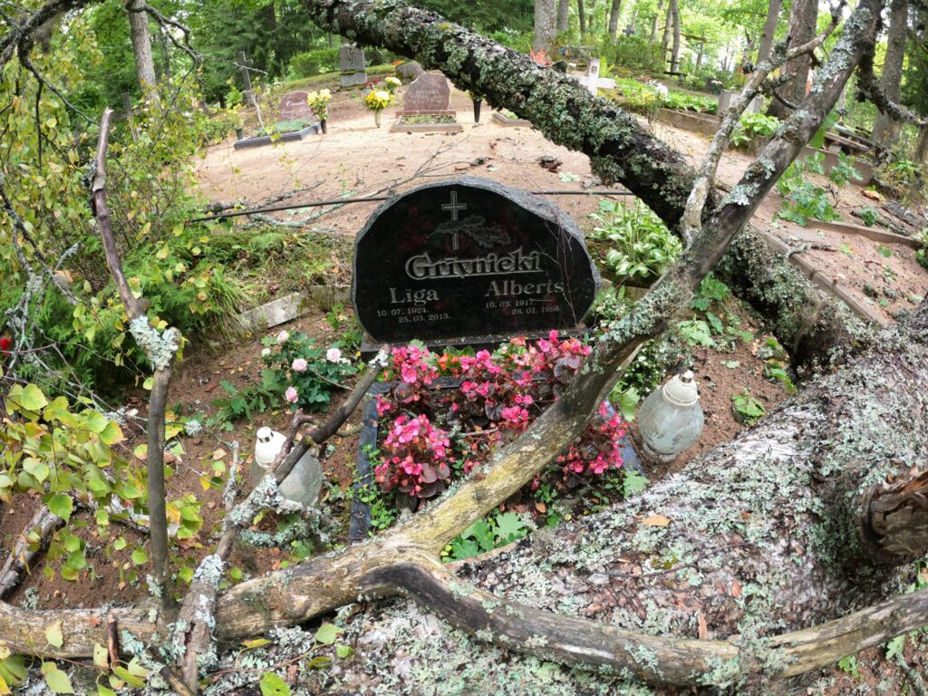 Vētras postījumus Alūksnes kapsētā fotokamerā fiksējis alūksnietis Alvits Grīvnieks. Viņam piezvanījusi kapu pārzine, vēstot, ka vētrā cietis viņa dzimtas kapu laukums, uz kura vētra nogāzusi koku. “Apskatīju un meitai nofotografēju postījumus, bet atstāju visu, kā ir. Man solīja, ka “Spodras” darbinieki par koka novākšanu parūpēsies, pēc tam visu sakopšu. Vecu soliņu salauza, pirkšu jaunu, sētas stieņi saliekti… Varbūt, kad zāģēs, vēl kaut kas cietīs, stādījumi vai kas, to jau nevar zināt, tādēļ jāvērtē pēc tam,” stāsta A. Grīvnieks.