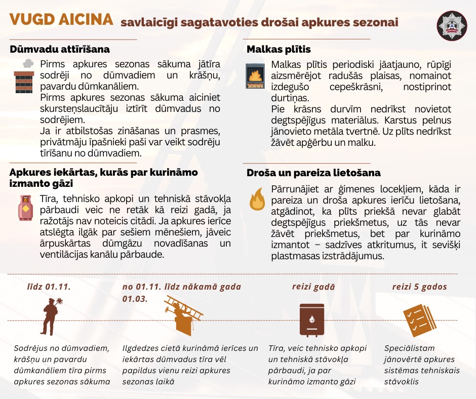 Lai šī apkures sezona norisinātos bez traģiskiem ugunsgrēkiem, līdz tās sākumam VUGD aicina iedzīvotājus parūpēties par ugunsdrošību savos mājokļos – iztīrīt dūmvadus, pārbaudīt apkures ierīces, kā arī nodrošināties ar kvalitatīvu malku, briketēm, granulām utt. Bet ja nelaime tomēr notikusi, aicinām nekavēties, bet zvanīt 112, lai ugunsdzēsēji glābēji varētu doties palīgā.