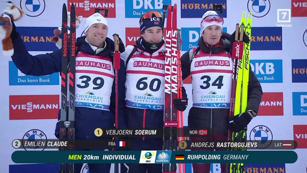 Sērums finišēja 47 minūtēs un 30 sekundēs, bet Klods atpalika 52,1 sekundi, abiem šaujot bez kļūdām. Rastorgujevs no Kloda atpalika 4,7 sekundes, bet nākamais sekotājs šveicietis Niklass Hartvegs bija vairāk nekā 23 sekundes lēnāks par Rastorgujevu.