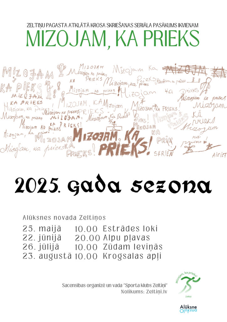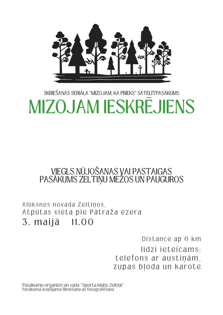 Pavasaris Zeltiņos atnāk ar sparu un kustību prieku – jau 3. maijā notiks sezonas atklāšana Zeltiņu pagasta atklātā krosa skriešanas seriāla pasākumam “Mizojam, ka prieks”, kas šogad sākas ar īpašu ieskrējienu – vieglu nūjošanu vai pastaigu Zeltiņu mežos un pauguros pie Pātraža ezera. Pulcēšanās atpūtas vietā pie Pātraža ezera no plkst. 11.00, un gaidāms ap 6 km garš pārgājiens, kurā svarīgākais nav rezultāts, bet gan kopā būšana, kustība dabā un iedvesmojošs sezonas sākums.